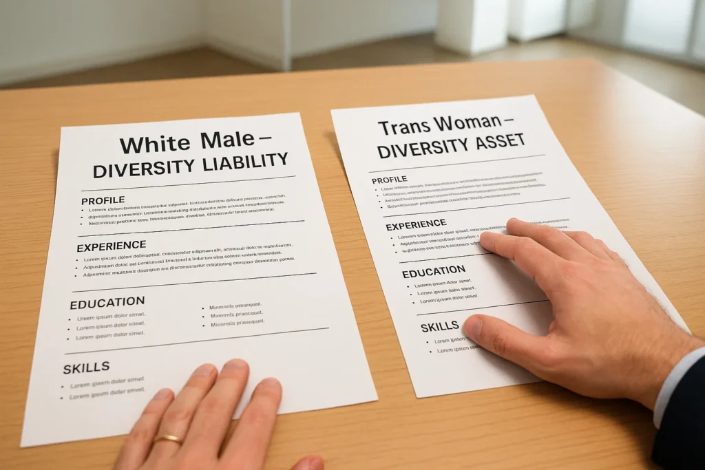 Why? Because modern corporations don’t run on merit; they run on ESG scores and DEI compliance metrics. MSCI, the world’s largest ESG rating agency, literally counts LGBT+ representation as a scoring bonus. A biological White male is a drag on the balance sheet. A “trans woman” is an investor-friendly checkbox. It’s a cold, calculated exchange: identity for immunity. In other words, a new form of identity tourism—slipping into a costume to travel across the cultural map and collect unearned privileges.